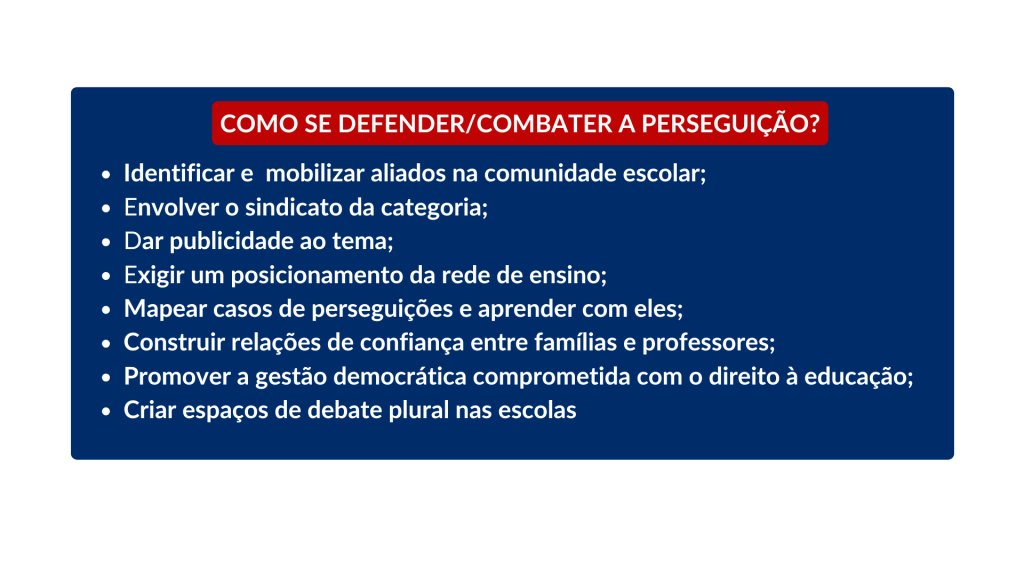 Qualificar a cobertura que a mídia faz dos casos violência e realizar pesquisas na área também são estratégias para enfrentar a perseguição e a censura aos educadores, analisa Fernando. “Ter uma dimensão real desse cenário é muito importante. Pesquisas e reportagens bem feitas dão materialidade para que os educadores saibam o que está acontecendo. A partir da identificação do problema podemos cobrar as autoridades, bater na porta de quem promove essa violência e pensar em mobilizações coletivas”.