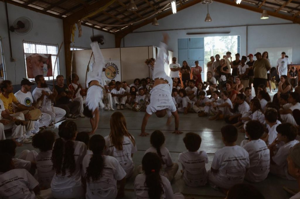 A iniciativa fortalece os laços comunitários e valoriza a cultura afro-brasileira. Cada movimento ensina respeito, disciplina e identidade. Um retrato da capoeira como ferramenta de transformação social. (Foto: Júlia Graboski)