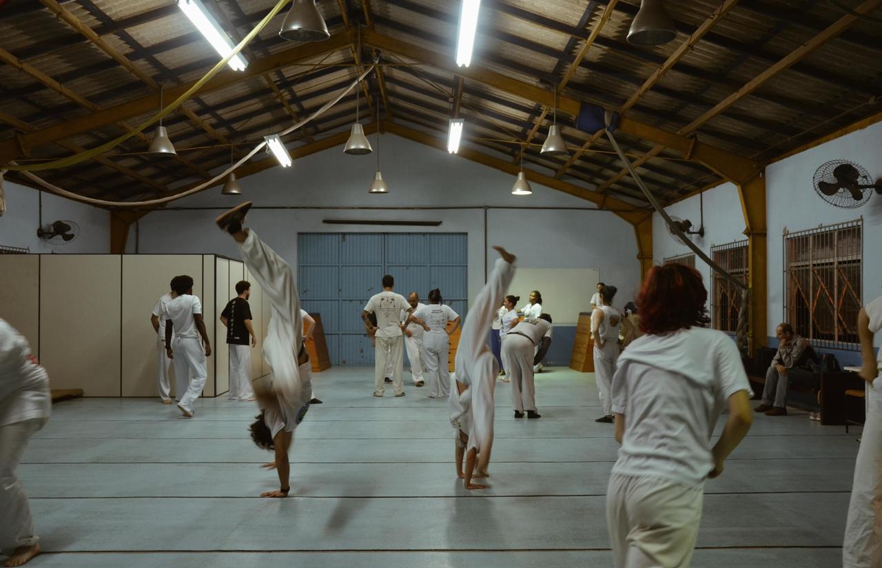 em momentos de aprendizado, canto e movimento. Com o som do berimbau conduzindo a roda,