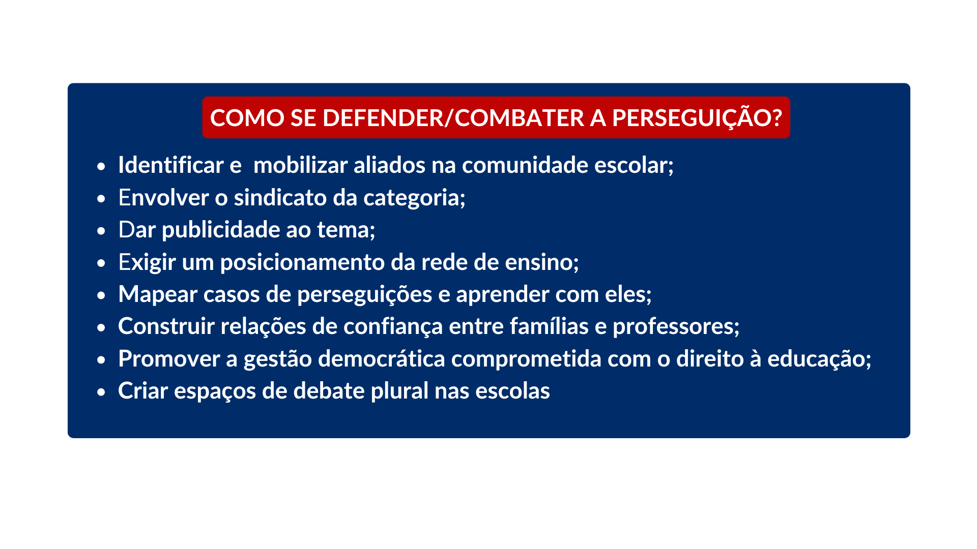 O manual de defesa contra a censura nas escolas, produzido em 2018 com a colaboração de mais de 80 entidades da educação e dos direitos humanos, traz explicações sobre como identificar violências, quais são os processos mais comuns movidos contra professores, as bases legais que amparam a liberdade de cátedra e canais para atendimento. O documento ainda aponta um passo a passo a ser seguido pelo educador vítima de violência: